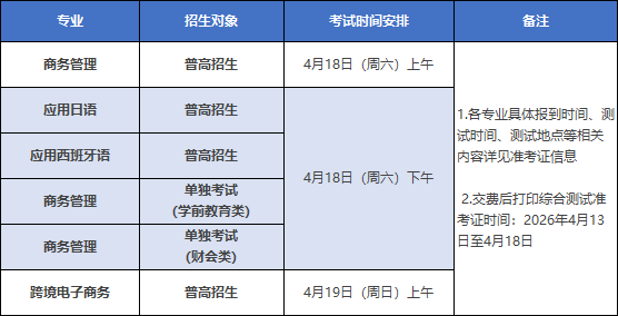 二、重要提醒 1. 考生可自行登录报名系统(https://gztq.zyufl.edu.cn/)查看报考状态。如有疑义,请联系我校招生办,联系电话0575-88343001 88343002 88343003 88343004 88343005。 2.通过资格审查的考生,在2026年3月26日至4月9日期间缴纳考试费用140元/人,缴费成功后因个人原因未参加考试,考试费用不退还。 3.学校综合素质测试时间为2026年4月18-19日。各专业考试安排如下,具体场次报到测试时间、地点等相关内容详见准考证信息,交费后打印综合测试准考证时间:2026年4月13日至4月18日。